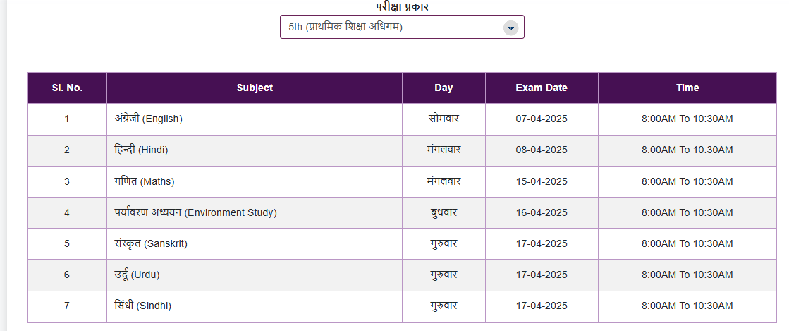 Rajasthan Board fifth Examination Routine 2025 ~ OverAll