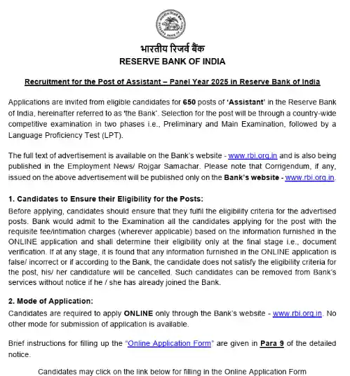 आपकी जानकारी के लिए बता दें कि यह भर्ती सिर्फ असिस्टेंट के पदों पर हो रही है। अगर आप भी इस भर्ती के लिए आवेदन करना चाहते हैं तो आवेदन प्रक्रिया भी आज यानि 16 फरवरी 2026 से शुरू हो गई है। और जो भी इच्छुक और योग्य उम्मीदवार हैं, वे RBI की आधिकारिक वेबसाइट rbi.org.in पर जाकर 08 मार्च 2026 तक ऑनलाइन माध्यम से आवेदन कर सकते हैं। आवेदन की पूरी जानकारी आपको आगे लेख में मिल जाएगी।