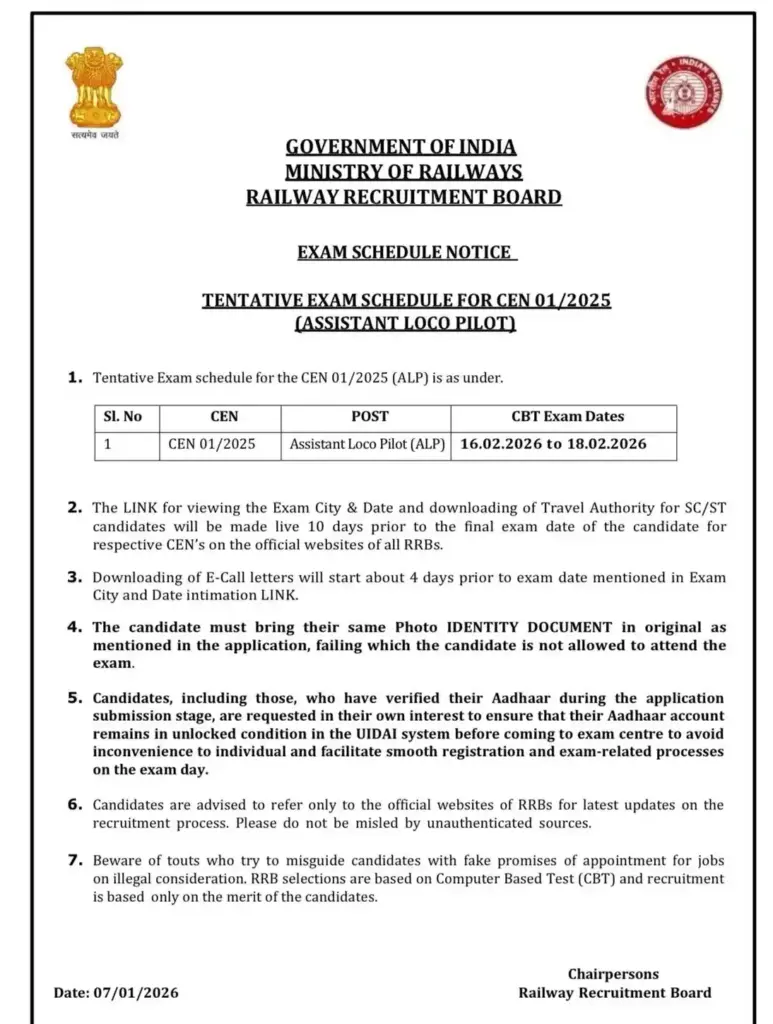 अगर आप भी RRB Assistant Loco Pilot (ALP) Admit Card And Examination 2026 की जानकारी लेना चाहते हैं और अपना एडमिट कार्ड डाउनलोड करना चाहते हैं, तो आपका हमारे इस लेख में स्वागत है। आपको बता दें कि RRB ने आज यानि 07 जनवरी 2026 को एक नोटिस जारी किया है जिसमें Assistant Loco Pilot (ALP) की CBT परीक्षा 16 फरवरी 2026 से 18 फरवरी 2026 तक होने की जानकारी दी है। जिन भी उम्मीदवारों ने आवेदन किया है, वे अपना एडमिट कार्ड 12 फरवरी 2026 के आसपास डाउनलोड कर सकते हैं। RRB ने ALP के लिए कुल 9,970 पदों पर भर्तियाँ निकाली हैं। यह परीक्षा CEN 01/2025 के तहत हो रही है।
