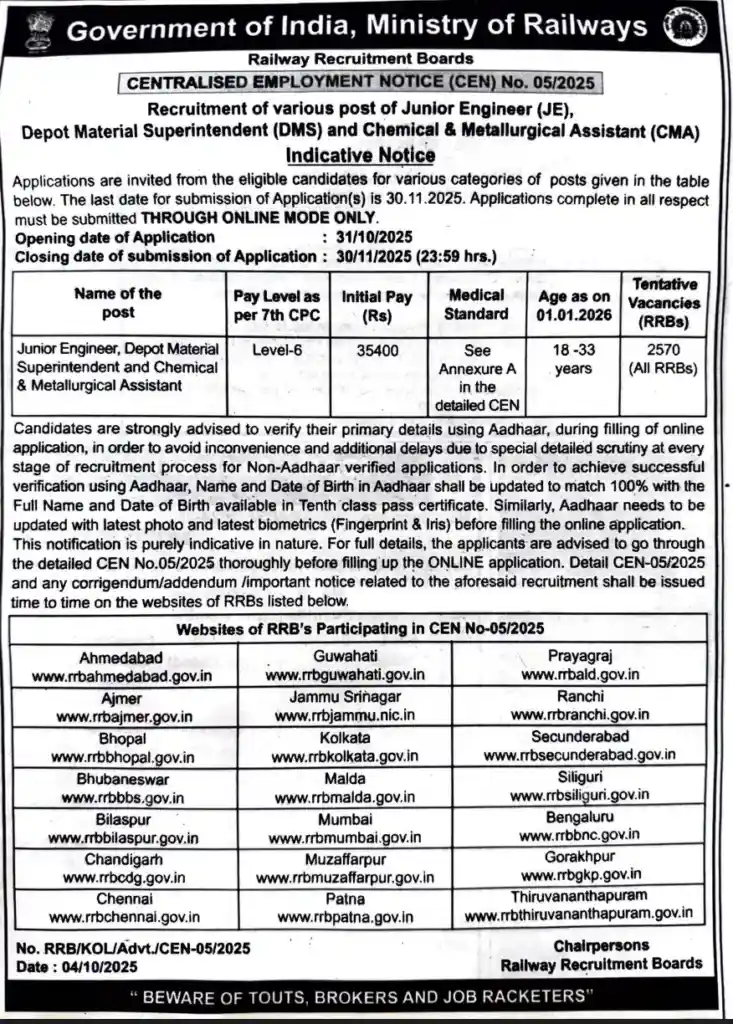 Railway की तरफ से हर महीने कोई न कोई भर्तियाँ निकल रही है अभी कुछ दिन पहले Railway ने RRB NTPC Recruitment 2025 के लिए brief नोटिस जारी किया था। अगर आपने RRB NTPC Recruitment 2025 का लेख नहीं पढ़ा, तो उसकी डिटेल्स भी पढ़ लें। और अब RRB JE Recruitment 2025 के लिए नोटिस जारी कर दिया है जो युवाओं के लिए एक अच्छी खबर है। इस नोटिफिकेशन CEN No. 05/2025 के अनुसार JE, DMS और CMA के कुल 2570 पद भरे जाने वाले हैं।