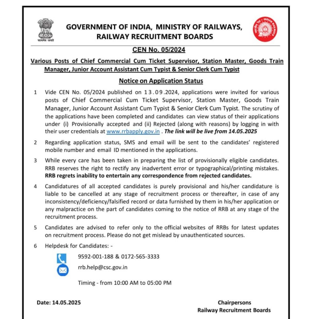 रेलवे भर्ती बोर्ड द्वारा ग्रेजुएट लेवल एनटीपीसी आवेदन स्थिति (Software Standing) की जानकारी 14 मई 2025 को जारी कर दी गई है। अब सभी उम्मीदवार यह जांच कर सकते हैं कि उनका आवेदन स्वीकार किया गया है या नहीं। आप सभी को बता दे की Software Standing Verify करना बेहद महत्वपूर्ण होता है क्योंकि गलत जानकारी या दस्तावेजों की कमी के कारण आवेदन निरस्त हो सकता है। आवेदन की स्थिति जानने के लिए उम्मीदवारों को अपनी रजिस्ट्रेशन आईडी और पासवर्ड की आवश्यकता होगी।