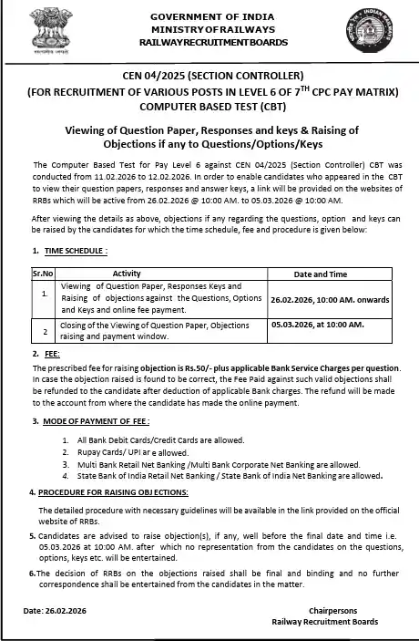 Necessary Dates of RRB Part Controller Reply Key 2026