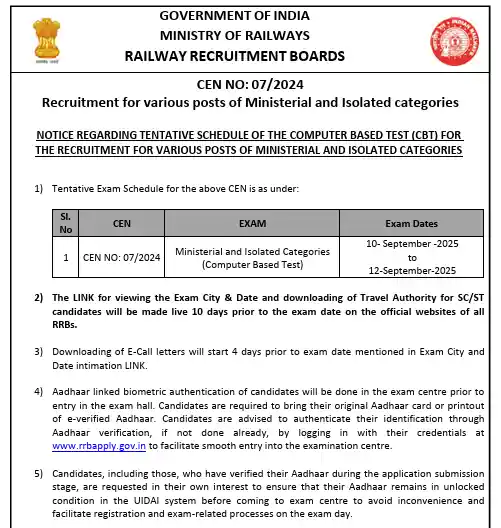 RRB Ministerial and Remoted Classes Examination Dates 2025 |
