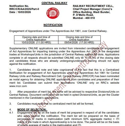 RRC Central Railway Apprentices Recruitment 2026: अगर आपने भी हालही में अपनी 10वीं या ITI पूरी की है और अब भारतीय रेलवे में अपरेंटिस ट्रेनिंग में भर्ती होना चाहते हैं, तो आपके लिए एक अच्छी खबर आ गई है। आपको बता दें कि Railway Recruitment Cell (RRC) Central Railway ने 10 मार्च 2026 को अपनी आधिकारिक वेबसाइट पर एक नोटिफिकेशन जारी की है। जिसमें Central Railway ने Apprentice की नई भर्ती के लिए कुल 51 स्लॉट्स पर आवेदन मांगे हैं।