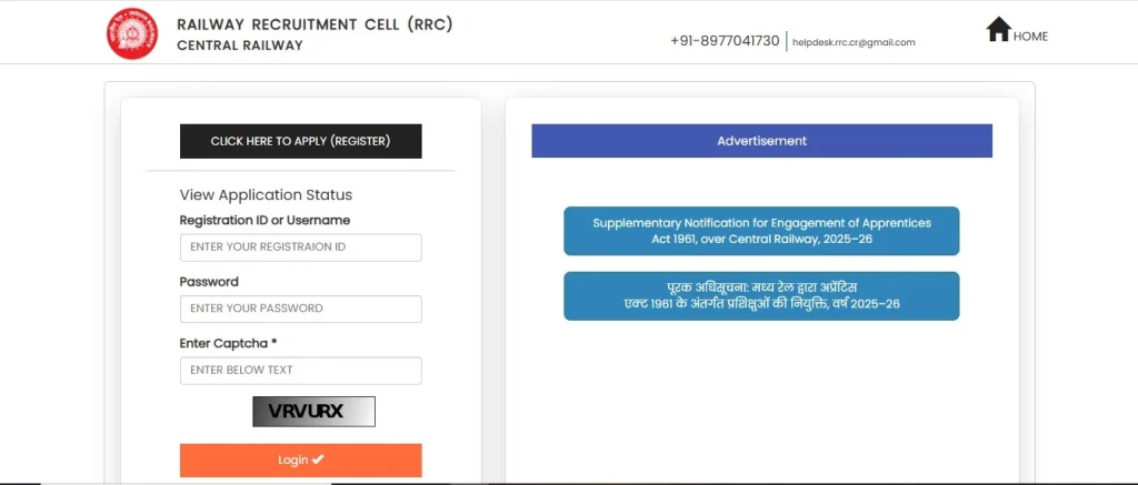 अगर आप भी RRC Central Railway Apprentices Recruitment 2026 की इस भर्ती के लिए अप्लाई करना चाहते हैं, तो आपको ऑनलाइन माद्यम से ही आवेदन करना होगा। आवेदन के लिए नीचे दिए गए स्टेप्स को फॉलो करें: