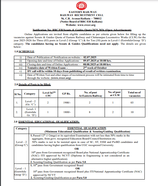 प्रत्येक आवेदक जो कि, RRC ER Apprentice Recruitment 2025 मे आवेदन करना चाहते है वे इस भर्ती मे 14 अगस्त, 2025 से लेकर 13 सितम्बर, 2025 तक अप्लाई कर सकते है और नौकरी प्राप्त कर सकते है।