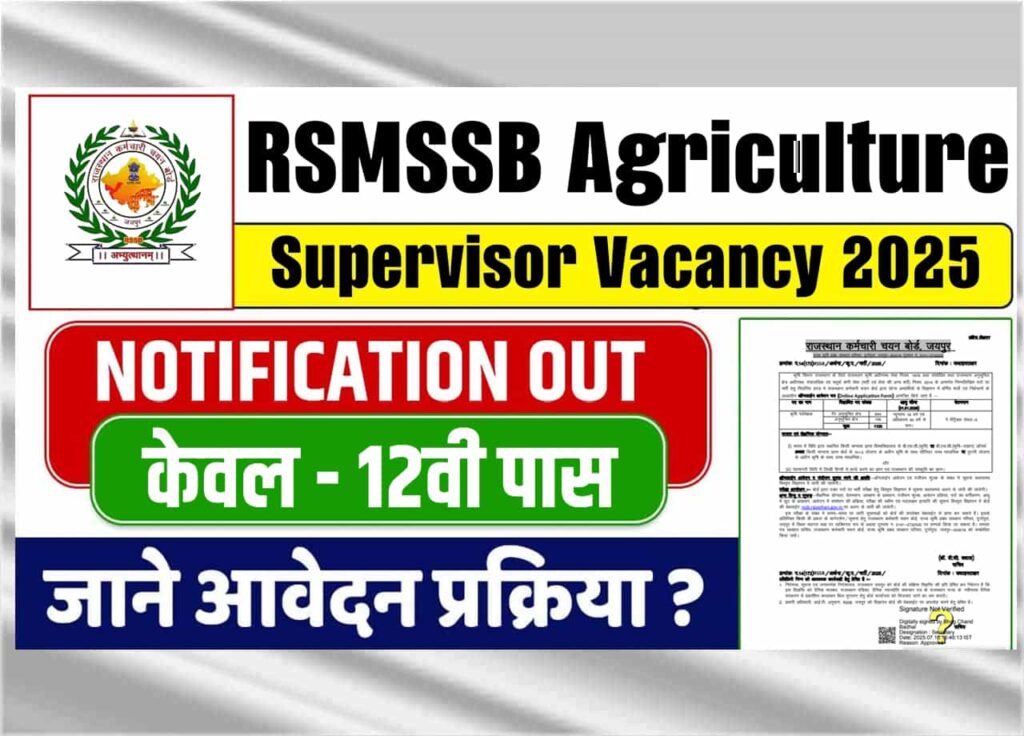 RSMSSB Agriculture Supervisor Emptiness 2025: अगर आपने भी 12वीं किया है और एग्रीकल्चर सुपरवाईजर के पद पर सरकारी नौकरी प्राप्त करना चाहते है तो आपके लिए अच्छी खबर है कि, राजस्थान कर्मचारी चयन बोर्ड, जयपुर द्धारा एग्रीकल्चर सुपरवाईजर के रिक्त कुल 1,000+ पदों पर भर्ती हेतु RSMSSB Agriculture Supervisor Emptiness 2025 को लेकर शॉर्ट नोटिस जारी किया गया है जिसकी पूरी – पूरी जानकारी आपको आर्टिकल मे प्रदान की जाएगी जिसके लिए आपको धैर्यपूर्वक इस आर्टिकल को पढ़ना होगा।