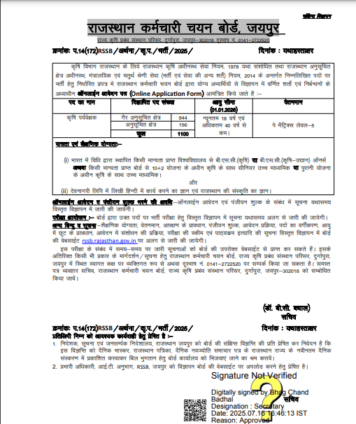 आप सभी आवेदको को बता दें कि, इस RSMSSB Agriculture Supervisor Emptiness 2025 के तहत रिक्त कुल 1,100 पदों पर भर्तियां की जाएगी।