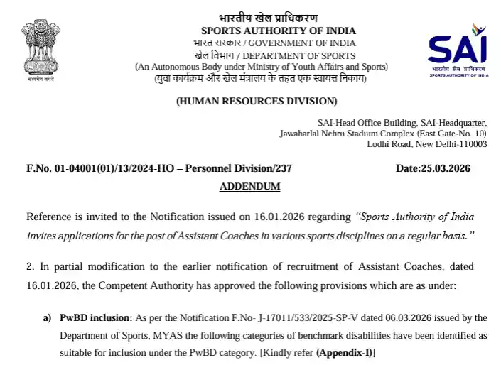 SAI Assistant Coach Recruitment 2026: अगर आपने भी स्पोर्ट्स कोचिंग में डिप्लोमा किया हुआ है और अब Sports activities Authority of India (SAI) में Assistant Coach के पद पर सरकारी नौकरी पाना चाहते हैं, तो आपके लिए एक अच्छी खबर आ गई है। आपको बता दें कि Sports activities Authority of India ने 23 मार्च 2026 को अपनी आधिकारिक वेबसाइट पर एक नोटिफिकेशन जारी की है, जिसमें अलग – अलग स्पोर्ट्स के लिए Assistant Coach के कुल 323 पदों पर हो रही भर्ती को फिर से Re-Open किया है।