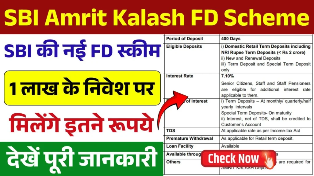 SBI Amrit Kalash FD Scheme: भारतीय स्टेट बैंक (SBI) देश के सबसे बड़े बैंको मे से एक है, जो अपने ग्राहको के लिए आकर्षक निवेश योजनाएं पेश करता है। इन्ही योजनाओ मे से एक SBI अमृत कलश FD स्कीम है, जो विशेष रूप से वरिष्ठ नागरिकों ओर आम जनता को सुरक्षित निवेश के साथ अच्छा रिटर्न देने का दावा करती है। यह स्कीम एसबीआई बैंक द्वारा खास उन नागरिकों के लिए शुरू की गई है जो एक निश्चित अवधि के लिए निवेश करना चाहते है और सुरक्षित रिटर्न की तलाश मे है।
