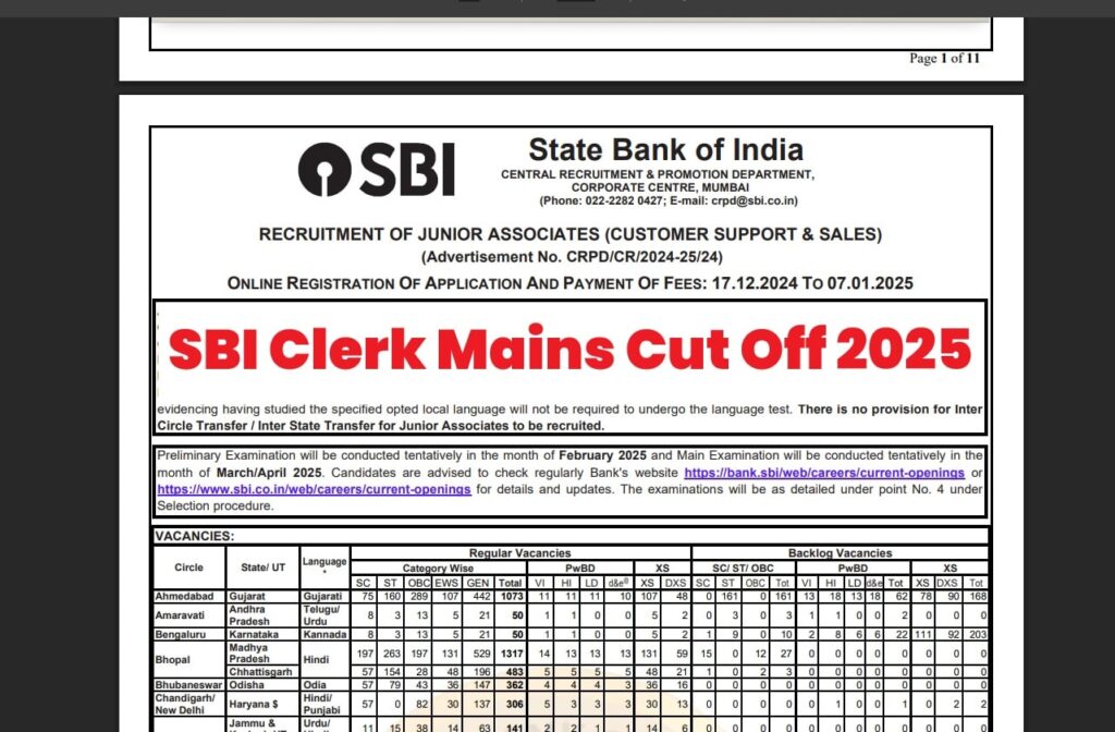SBI Clerk Mains Anticipated Lower Off 2025 – State-wise