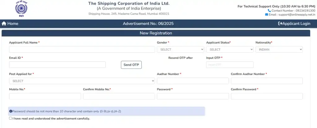 आवेदन केवल ऑनलाइन मोड से ही होगा। उम्मीदवारों को SCI की Official Web site पर जाकर ही आवेदन करना होगा।