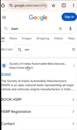 - SIAM HSRP Quantity Plate On-line Apply करने के लिए सबसे पहले आपको अपने स्मार्टफोन के क्रोम ब्राऊजर मे जाकर SIAM को टाईप करके सर्च करना होगा जिसके बाद आपको कुछ इस प्रकार का रिजल्ट मिलेगा –