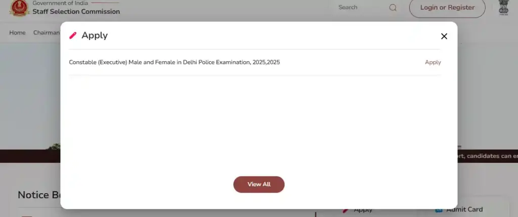 - जैसे ही आप क्लिक करेंगे एक popup बॉक्स ओपन होगा, इसमें आपको ‘Constable (Government) Male and Feminine in Delhi Police Examination, 2025’ के ‘Apply’ को ऑप्शन जाएगी। ‘Apply’ पर क्लिक करें।