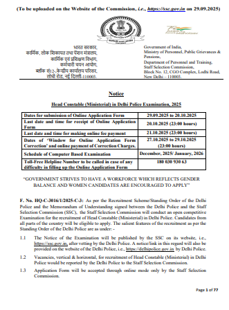SSC Delhi Police Head Constable Ministerial Notification 2025: Particulars