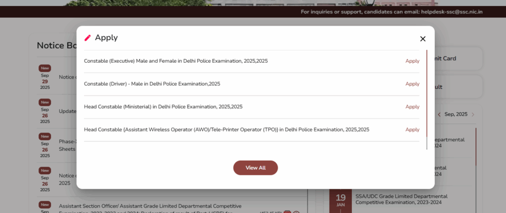 एक पॉपअप बॉक्स खुलेगा, जिसमें ‘Head Constable (Ministerial) in Delhi Police Examination, 2025’ के लिए ‘Apply’ लिंक पर क्लिक करें।