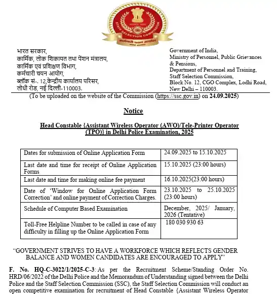 SSC Delhi Police Head Constable Recruitment 2025: SSC हर दिन युवाओं के लिए नई – नई भर्तियों की खुशखबरी लेकर आ रहा है। आपको बता दें कि Constable (Govt), Constable (Driver) की भर्तियाँ पहले ही शुरू हो गई हैं और अब कर्मचारी चयन आयोग (SSC) ने 24 सितंबर 2025 को दिल्ली पुलिस में हेड कांस्टेबल (Assistant Wi-fi Operator – AWO / Tele-Printer Operator – TPO) की भर्ती के लिए भी अधिसूचना जारी कर दी है। इस अधिसूचना में दिल्ली पुलिस ने पुरुष और महिला दोनों के लिए कुल 552 पदों पर भर्ती निकली है।
