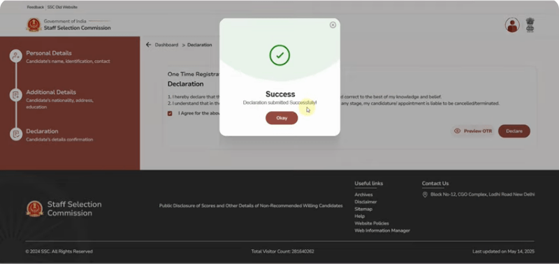 - इस प्रकार आप देख सकते है कि, सफलतापूर्वक आपका SSC OTR Registration पूरा हो जाता है जिसके बाद आपको अपने डैशबोर्ड पर आने के लिए Okay के विकल्प पर क्लिक करना होगा,