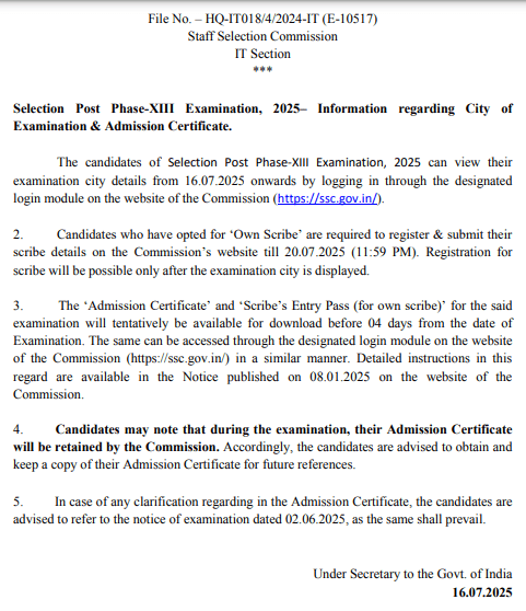 SSC Choice Put up Part 13 Examination Metropolis 2025 Launch On