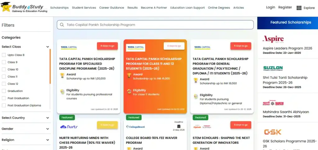 - होमपेज पर स्कॉलरशिप्स सर्च सेक्शन में Tata Capital Pankh Scholarship Program ढूंढें।