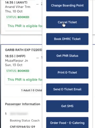 • अब यहां पर आप जिस टिकट को कैंसिल करना चाहते है उसका चयन करके उस पर आपको क्लिक करना होगा,