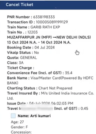 • क्लिक करने के बाद आपके सामने Cancel Ticket Particulars खुलकर आ जाएगा जो कि, इस प्रकार का होगा –