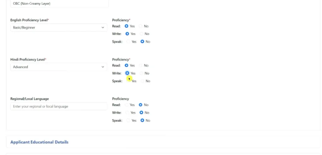 - इसके बाद आपको अपनी Language Proficiency भरनी होगी: