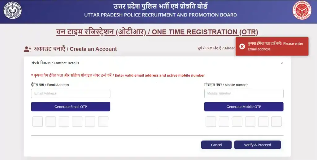 • OTR रजिस्ट्रेशन में नाम, मोबाइल, ईमेल, आधार डालकर रजिस्टर करें। और वेरीफाई करें।