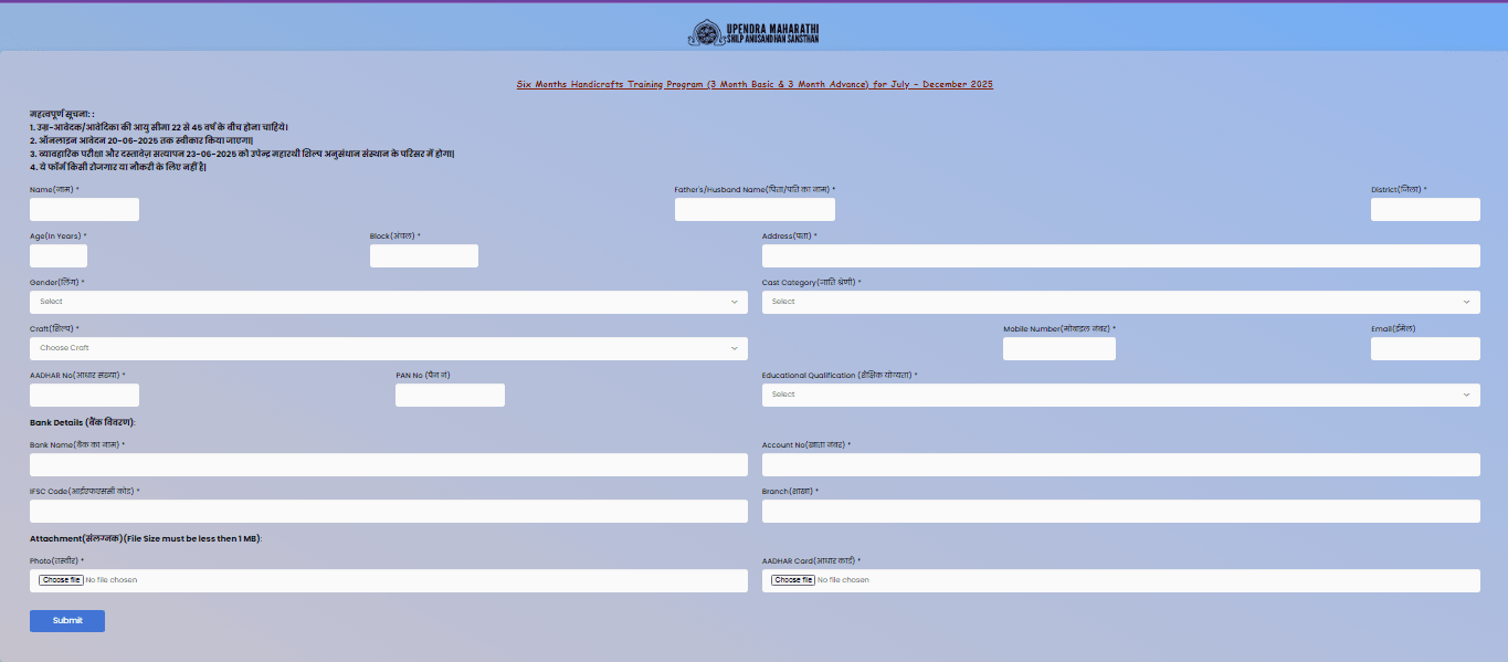 “text”: “प्रत्येक अभ्यर्थी जो कि, Upendra Maharathi Free Training 2025 के लिए अप्लाई करना चाहते है वे आगामी 20 जून, 2025 तक अप्लाई कर सकते है।”