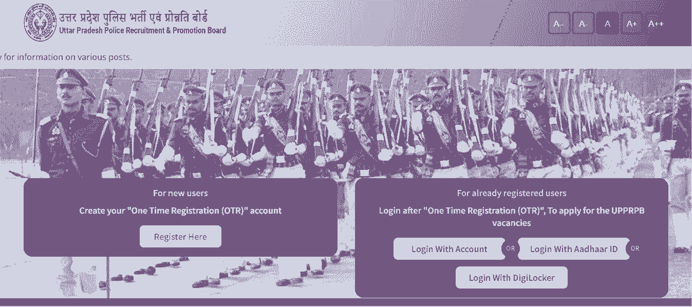 अपने सभी उम्मीदवारो सहित अभ्यर्थियों को बता देना चाहते है कि, ” उत्तर प्रदेश पुलिस भर्ती एंव प्रोन्नति बोर्ड ” द्धारा भविष्य के समस्त ऑनलाइन आवेदनों / भर्तियों हेतु अभ्यर्थी का ” One Time Registration ( OTR ) ” अनिवार्य कर दिया गया है जिसका सबसे बड़ा व मौलिक लाभ यह है कि, एक बार पंजीकरण के बाद उम्मीदवार को अलग – अलग भर्तियों मे आवेदन करने के लिए अपना व्यक्तिगत विवरण / Private Particulars ( नाम, पिता का नाम व जन्मतिथि ) को बार – बार भरने की जरुरत नहीं होगी और