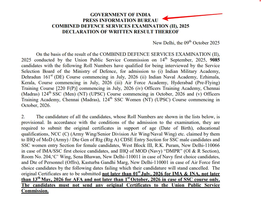 CDS 2 2025 नोटिफिकेशन जारी हुई |