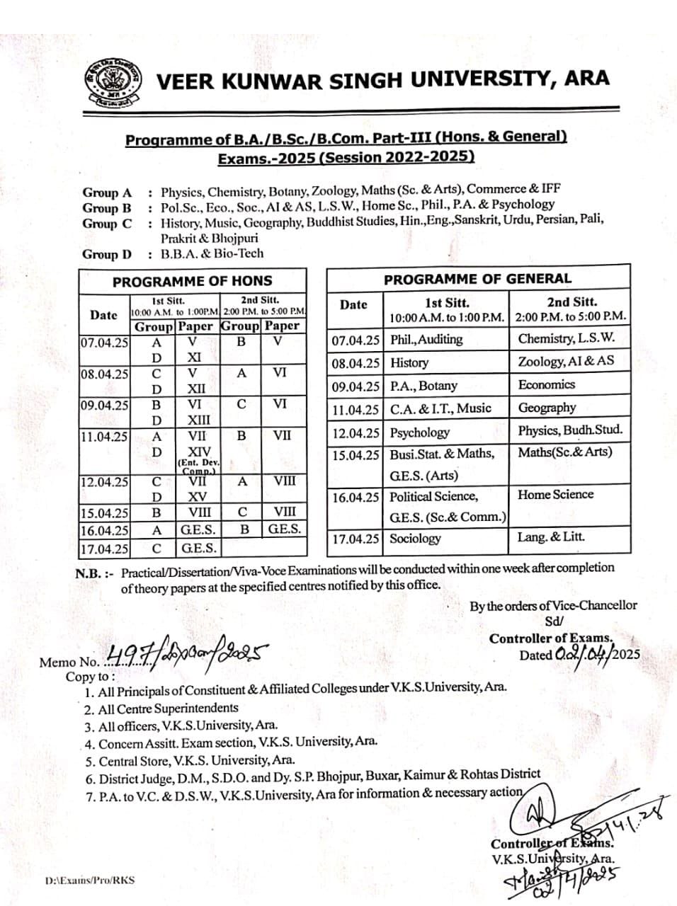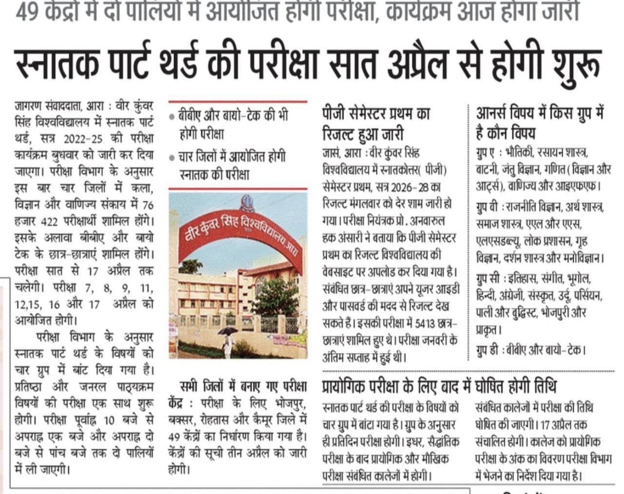 आरा: वीर कुंवर सिंह विश्वविद्यालय (VKSU) ने स्नातक पार्ट थर्ड (सत्र 2022-25) की परीक्षा का कार्यक्रम जारी कर दिया है। यह परीक्षा दो पालियों में आयोजित होगी और 7 अप्रैल 2025 से प्रारंभ होकर 17 अप्रैल 2025 तक चलेगी।