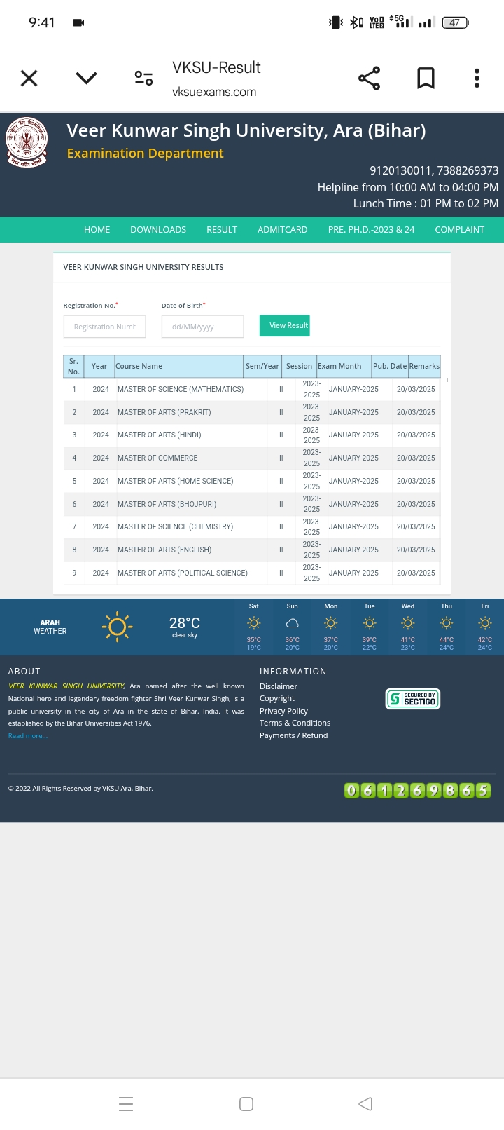 वी. के. एस. यू. फर्स्ट सेमेस्टर की रिजल्ट दिनांक 02 अप्रैल 2025 को देर रात तक यूनिवर्सिटी के अधिकारिक वेबसाइट पर जारी किया जाएगा।